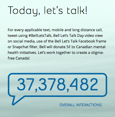 For every applicable text, mobile and long distance call, tweet using #BellLetsTalk, Bell Let’s Talk Day video view on social media, use of the Bell Let’s Talk Facebook frame or Snapchat filter, Bell will donate 5¢ to Canadian mental health initiatives. Let’s work together to create a stigma-free Canada!