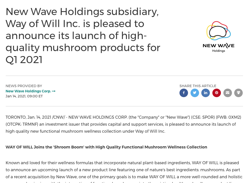 TORONTO, Jan. 14, 2021 /CNW/ – NEW WAVE HOLDINGS CORP. (the “Company” or “New Wave”) (CSE: SPOR) (FWB: 0XM2) (OTCPK: TRMNF) an investment issuer that provides capital and support services, is pleased to announce its launch of high quality new functional mushroom wellness collection under Way of Will Inc.